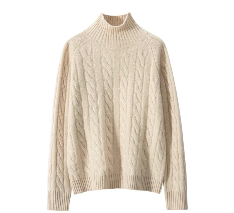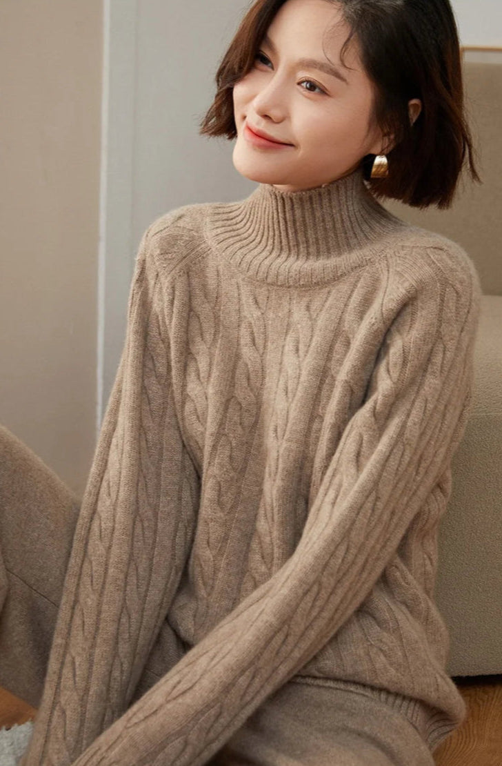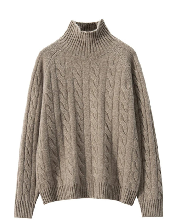 Elevate your style with our luxurious cable-knit cashmere sweater, designed for the sophisticated woman. Crafted from 100% pure cashmere, its intricate cable-knit design adds texture and charm, offering unmatched comfort and timeless refinement.