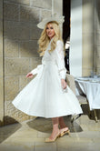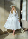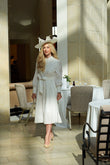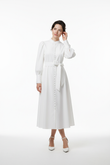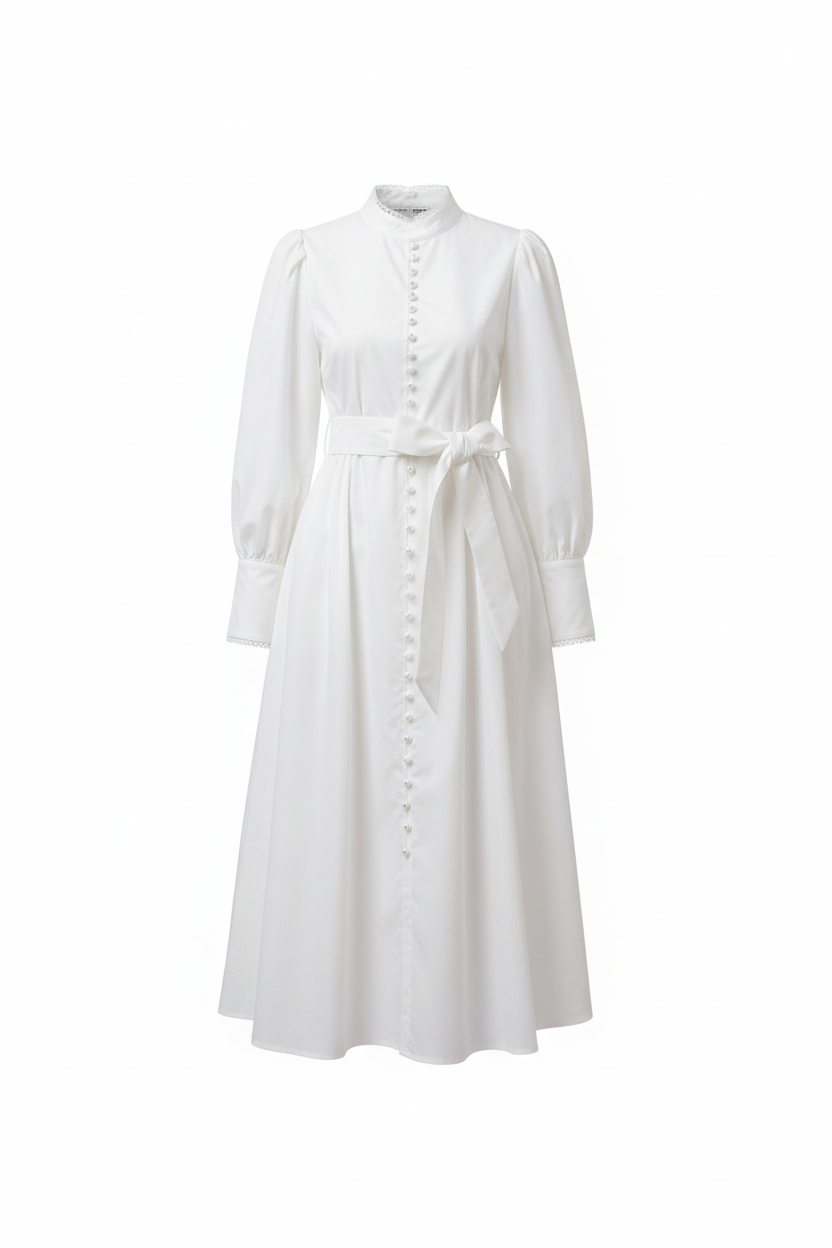 An ode to quiet elegance, the Margaux Dress blends structure and softness in perfect harmony. Crafted from a crisp, flowing fabric with a delicate sheen, it features a high collar, covered buttons, and romantic puffed sleeves. The defined waist, tied with a self-fabric belt, flatters the silhouette while maintaining a modest and refined line. Ideal for garden luncheons, holiday dinners, or simply embracing grace in the everyday.